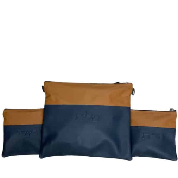 סט תיקי טלית ותפילין יוקרתי מעור אמיתי – דגם "קולור-בלוק" כחול וקאמל