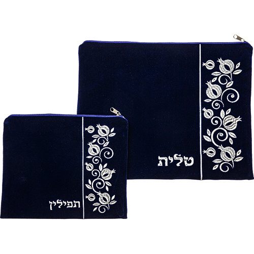 תיק לטלית ותפילין מקטיפה כחולה כהה עם רקמת רימונים כסופה