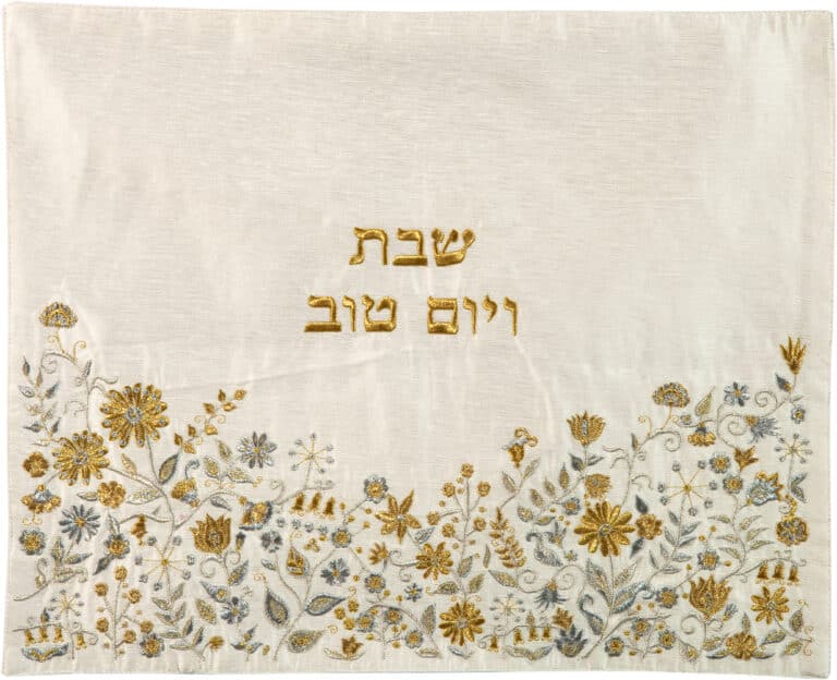 כיסוי חלה לשבת עם רקמה של פרחים בצבעי כסף וזהב