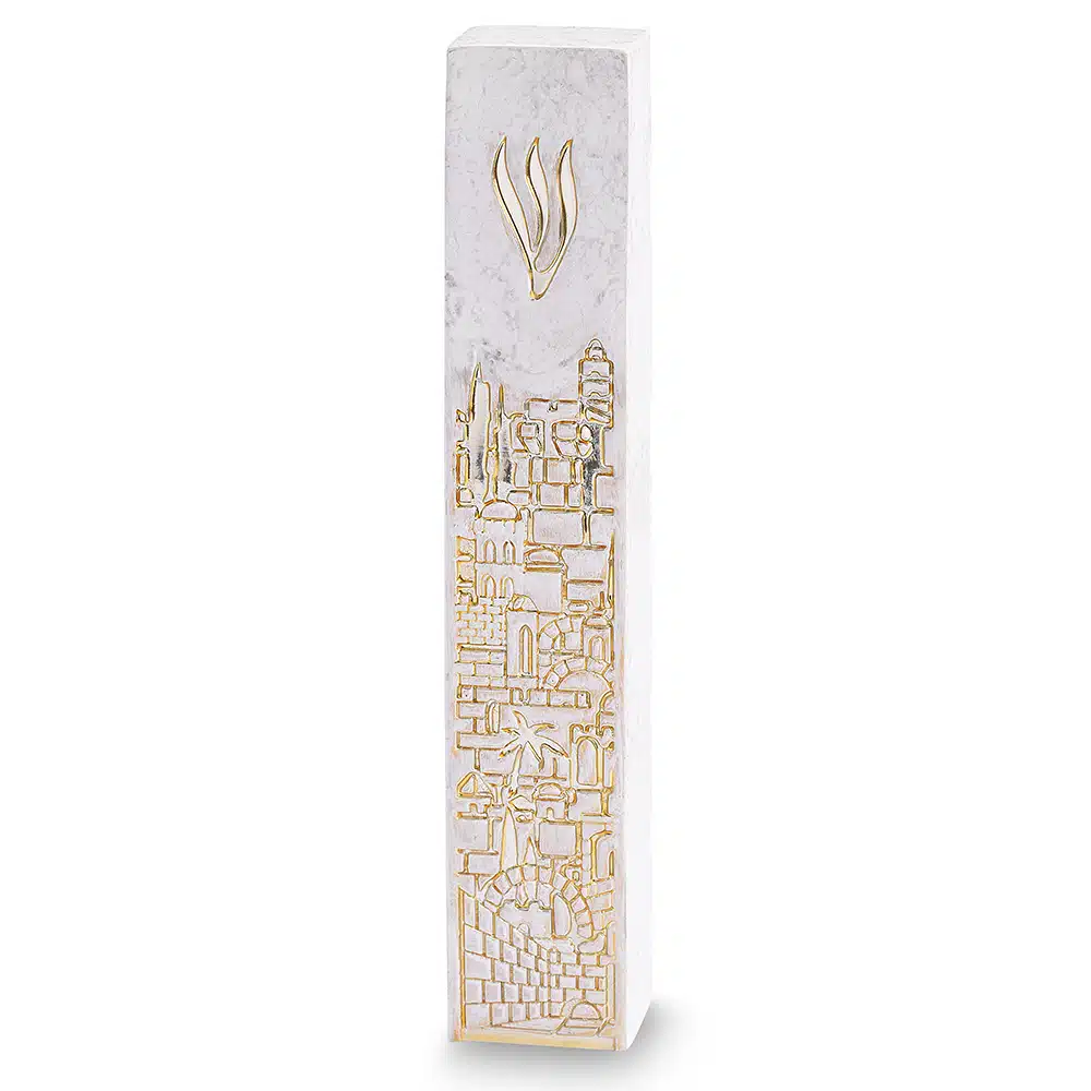 בית מזוזה גדול דמוי בטון במרקם אבן גולמי בעיטור נוף ירושלמי מוזהב – מתאים לכל קלף עד 20 ס"מ