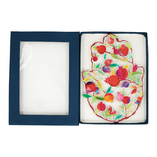 חמסה גדולה צבעונית בגימור לכה אמייל – דגם רימונים בסגנון ציור עיפרון.