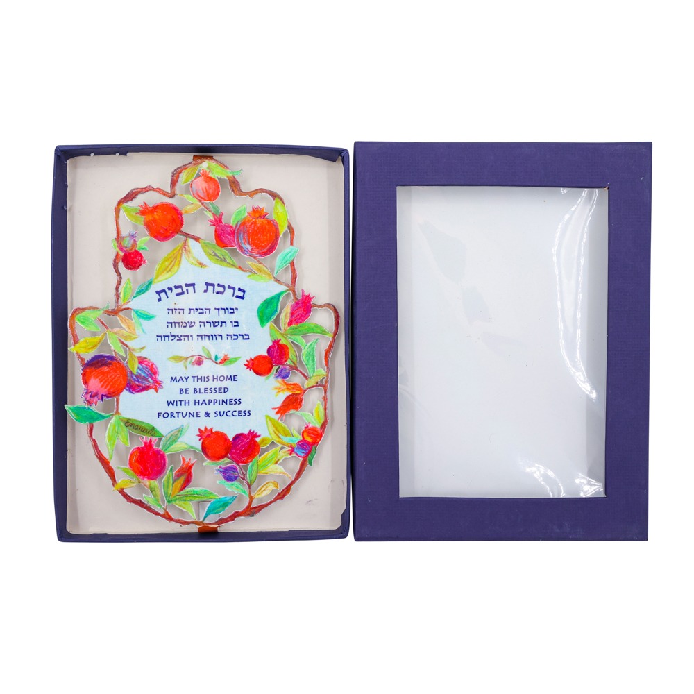 חמסה גדולה צבעונית עם ברכת הבית בעברית ואנגלית ועיטורי רימונים.