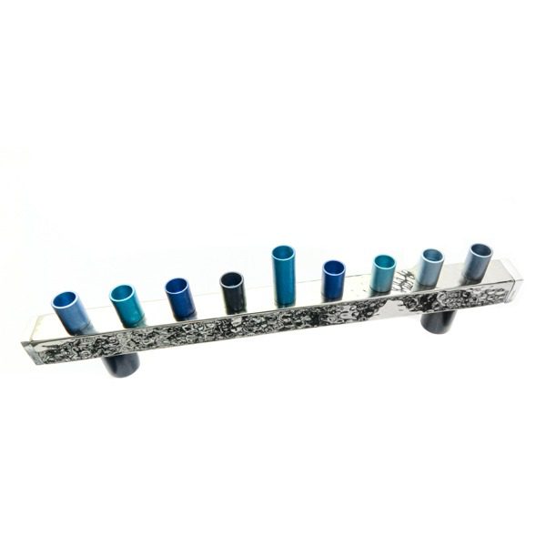 חנוכייה מפס אלומיניום מרוקע בציפוי ניקל עם קנים בגווני כחול