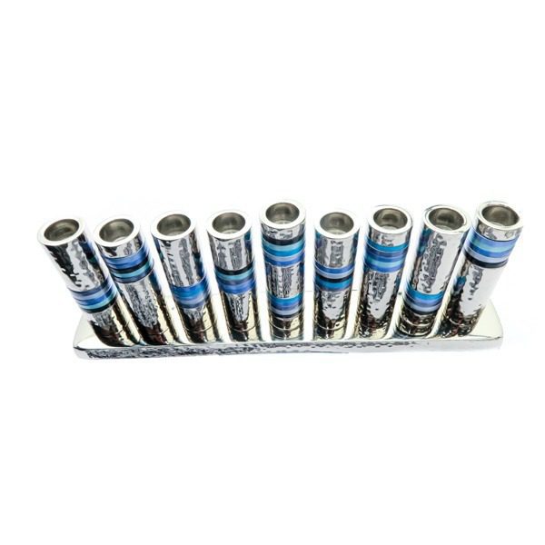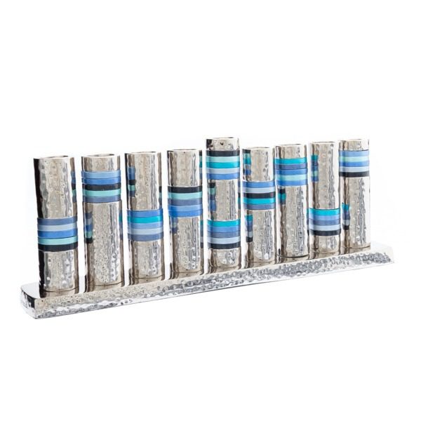 חנוכייה מקנים מאלומיניום מרוקע עם טבעות כחולות
