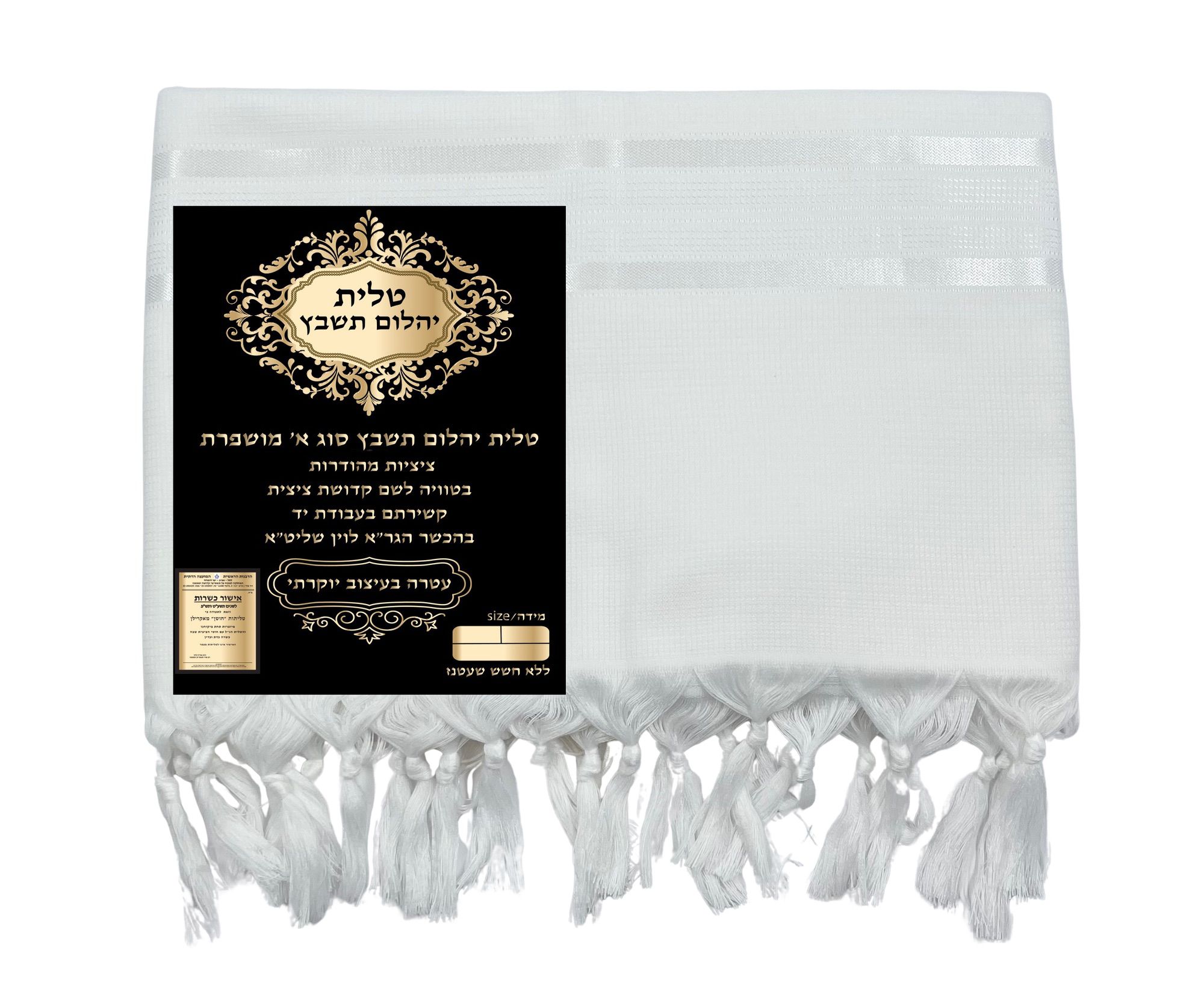 טלית אקרילן לבנה איכותית, סוג א' בגימור מוקפד עם עטרה בעיצוב יוקרתי.