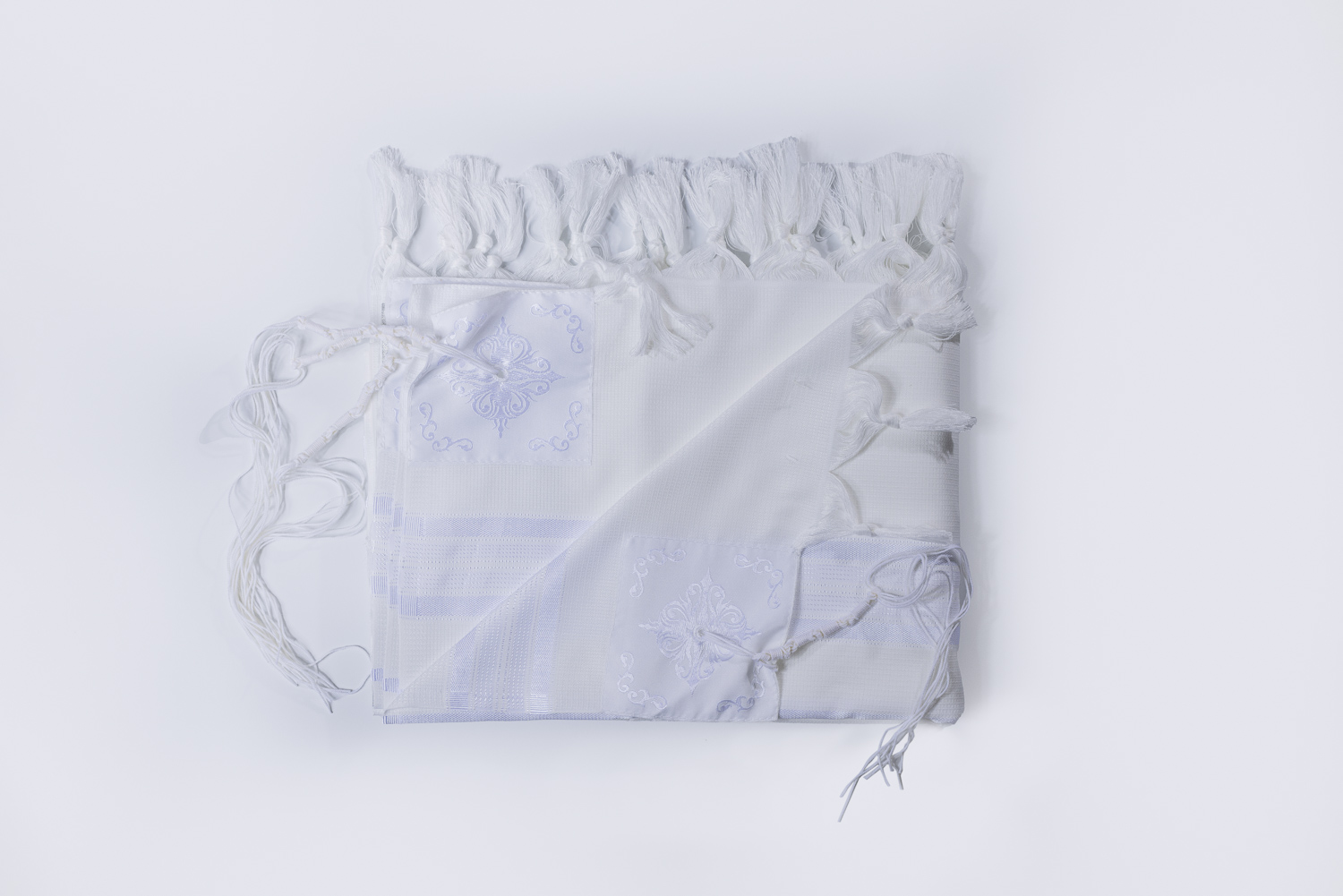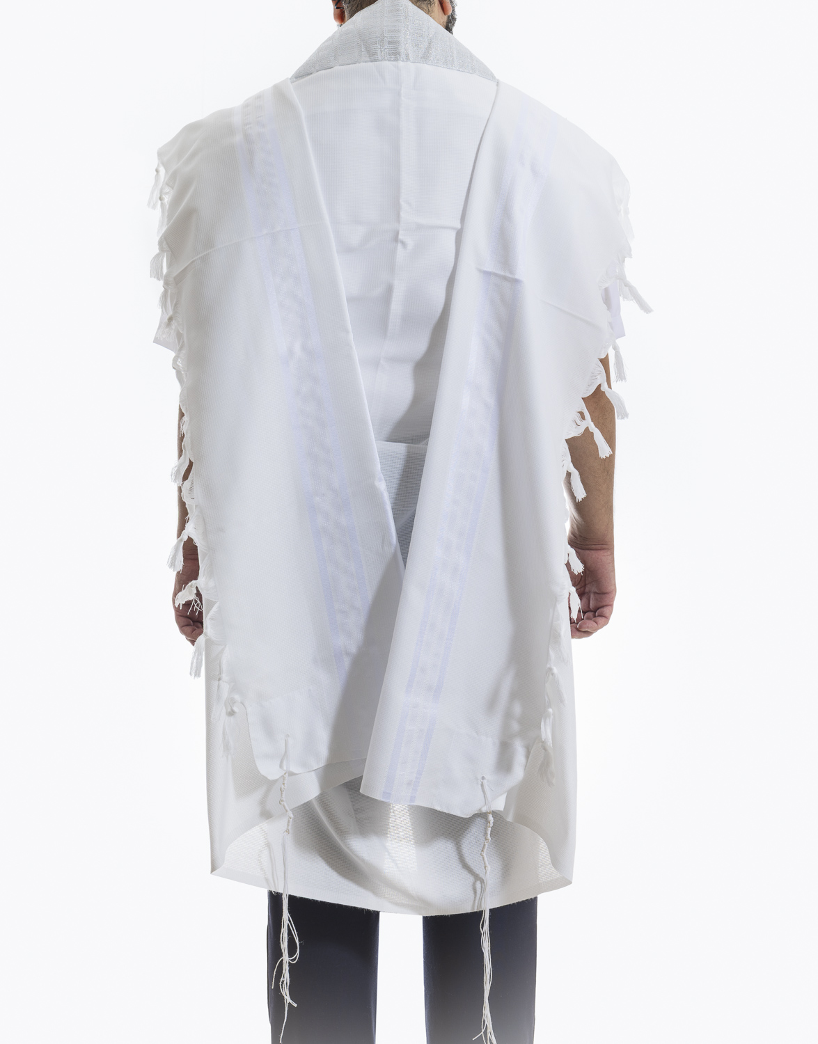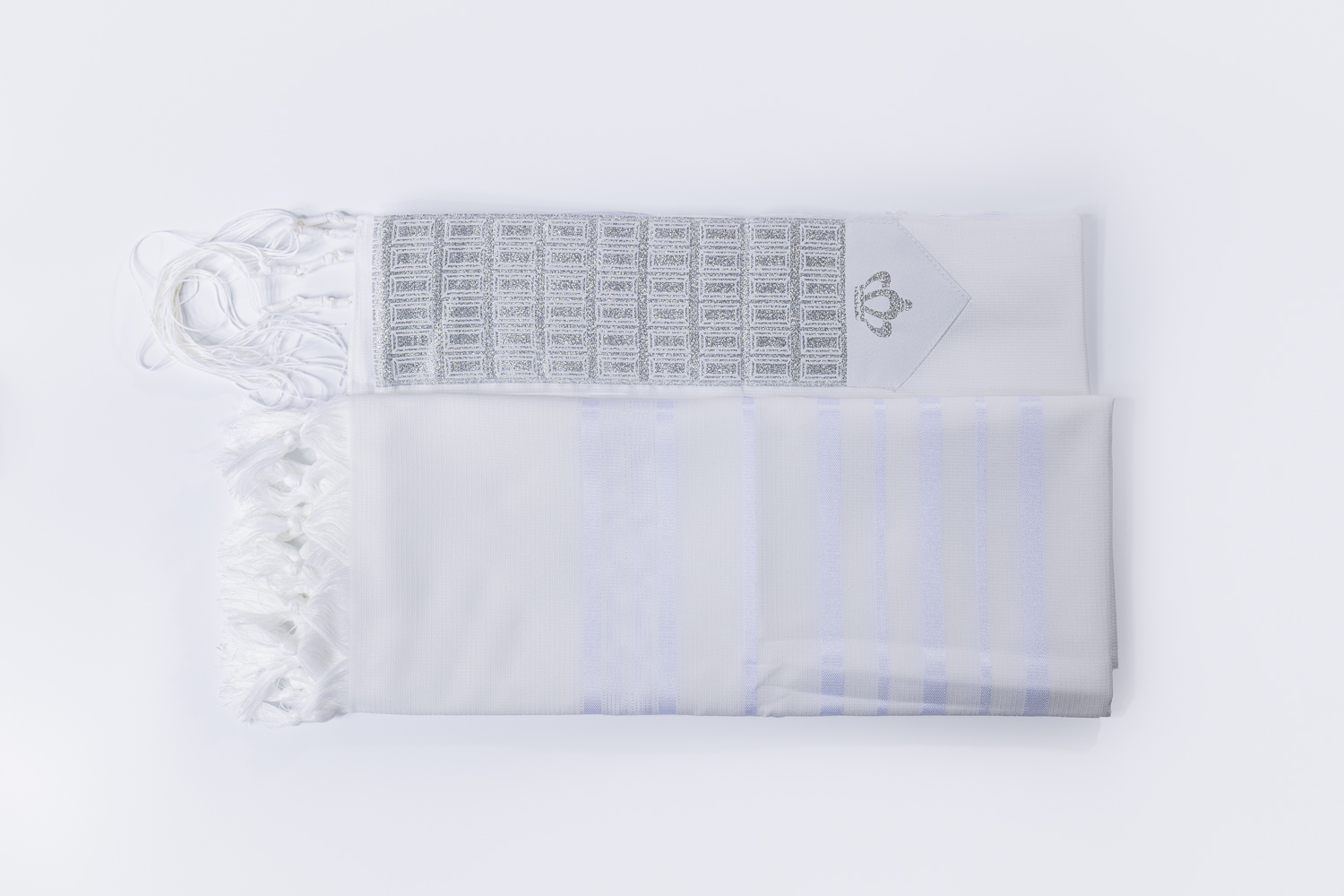 טלית אקרילן לבנה איכותית, סוג א' בגימור מוקפד עם עטרה בעיצוב יוקרתי.