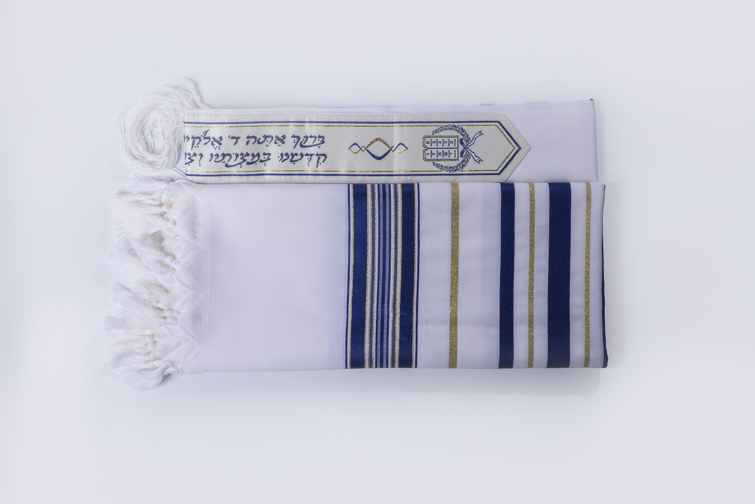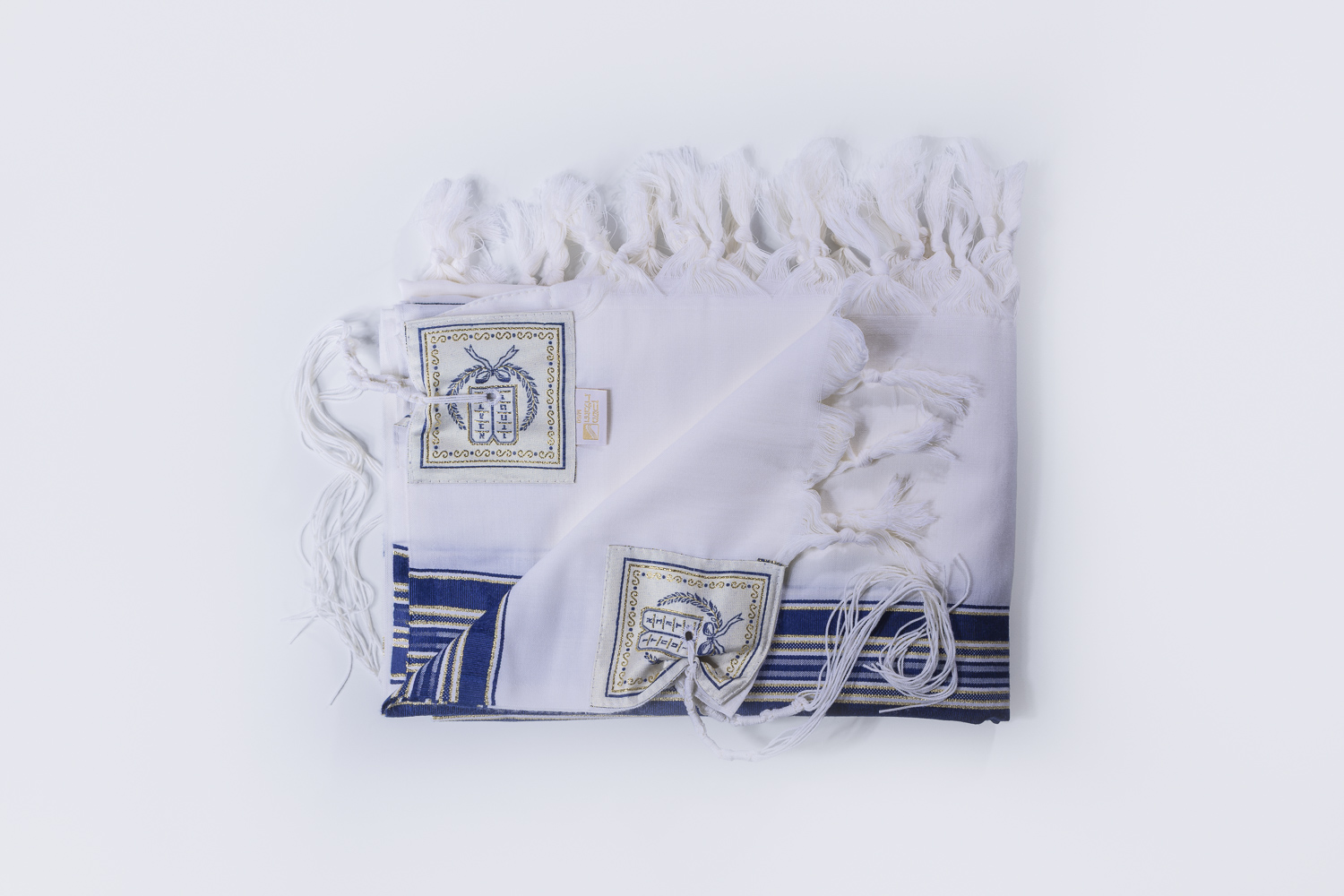 טלית מהודרת מצמר עם פסים בצבע כחול וזהב