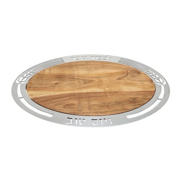 מגש לחלות שבת אובלי מעץ עם מסגרת נירוסטה בעיטור חיטים