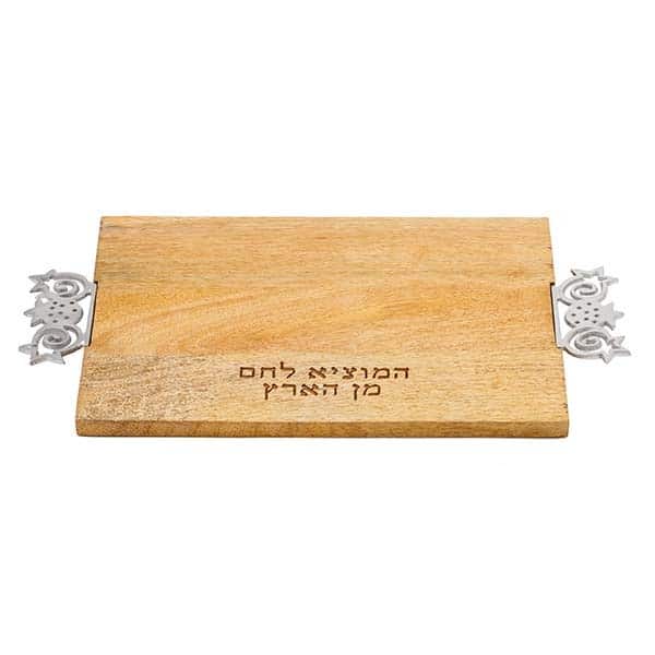 מגש לחלות שבת מלבני מעץ מעוטר בידיות מתכת בצורת רימונים