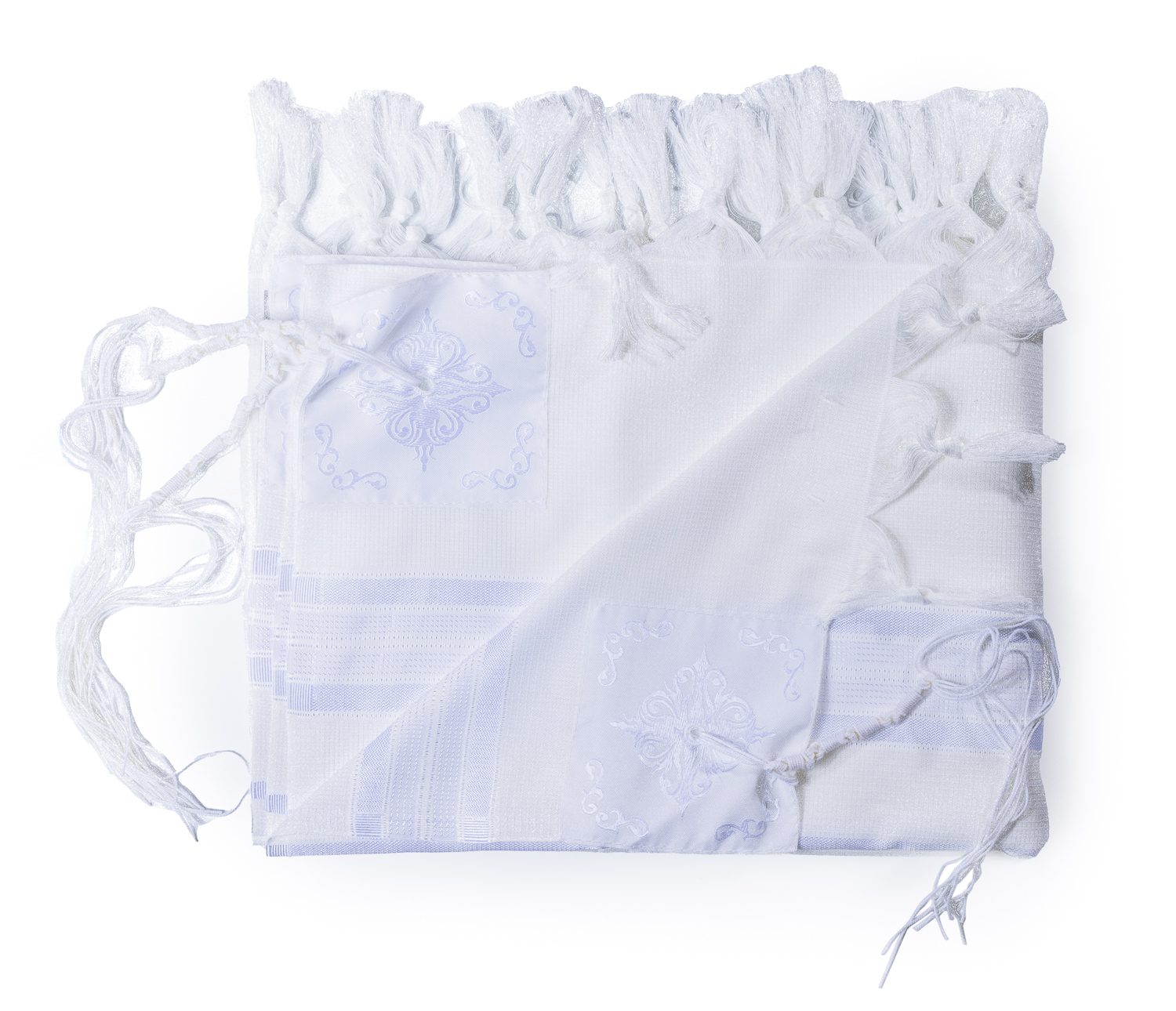 2. טלית אקרילן לבנה איכותית נעימה ולא מחליקה, עם עטרה בעיצוב יוקרתי.